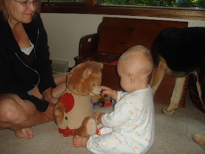 Aidan opening a gift from his Great-Grandma Irene. We were surprised to see Babe too, a family friend!